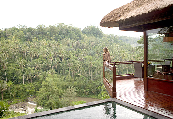 自生の木は伐採せず、ウブドの景観を乱さないように建てられたリゾート。随所でアユン川の絶景を満喫できます。 渓谷の大パノラマが一面に広がるメイン棟のロビーからの絶景は圧巻です。